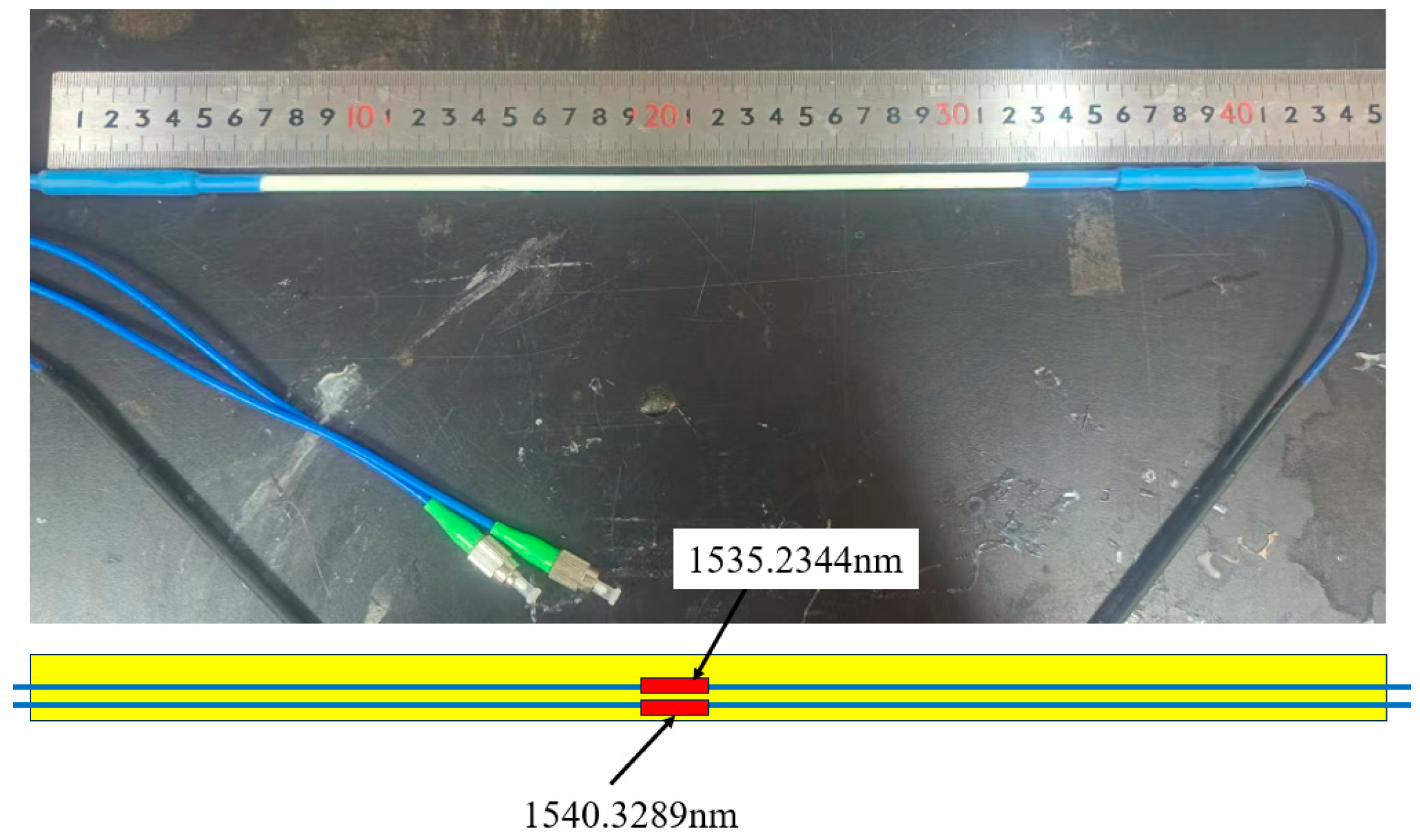 Figure 1 shows the schematic diagram of the sensor‘s structure. The sensor is named FRP-UWFBGN-M sensor (manufactured by Dalian Boruixin Technology Park Co., Ltd. in Dalian, China), which includes one ultra-weak FBG array I, one ultra-weak FBG array II, and FRP. Here, the jumper head of the sensor is not shown, and the uppercase letters N and M in the sensor name denote the number of ultra-weak FBGs and the spacing between weak fiber grating measurement points within a single ultra-weak FBG array, respectively. Ultra-weak FBG array I and ultra-weak FBG array II are embedded parallel to each other within the FRP reinforcement during the FRP pultrusion process. Ultra-weak FBG array I is positioned at the edge of the FRP reinforcement, primarily serving to identify the direction of lateral deformation, and ultra-weak FBG array II is positioned along the central axis of the FRP reinforcement, primarily serving to measure structural deformation. The spacing and number of the ultra-weak FBGs are determined by monitoring requirements. The FRP-UWFBG sensor is manufactured using the FRP pultrusion process and has a diameter of 5.0 mm. The FRP may be GFRP (glass fiber reinforced polymer), CFRP (carbon fiber reinforced polymer), or BFRP (basalt fiber reinforced polymer). The FRP used in this study is GFRP, and its elastic modulus, shear strength, and ultimate tensile strain are 45 GPa, 740 N, and 1.6%, respectively [
