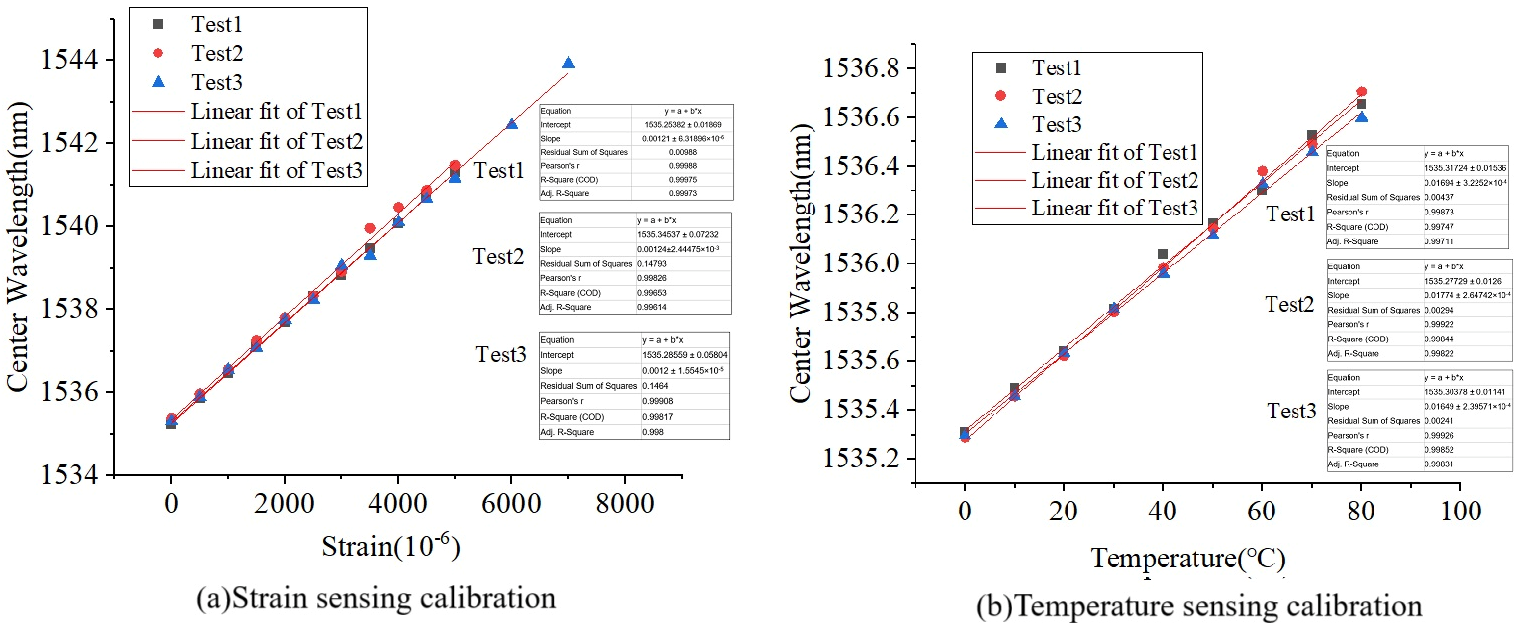 Table 2 lists the strain sensing coefficients and temperature sensing coefficients for the three tests, respectively. It can be seen that the average strain and temperature sensing coefficients are 1.22 pm/με and 17.06 pm/°C, respectively, and all linear correlations reached values above 0.999.