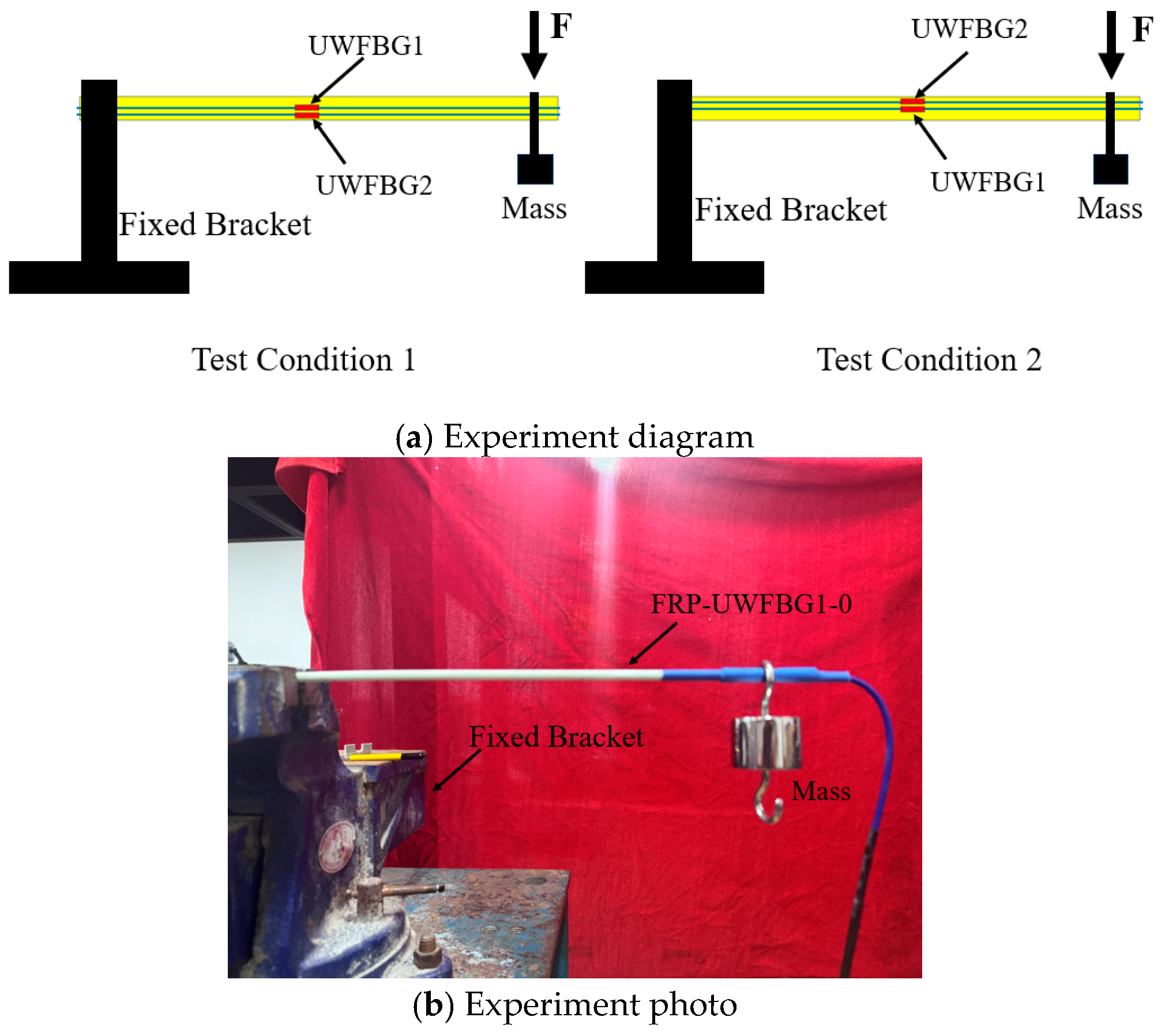 Figure 5 shows the schematic diagram and photograph of the sensor direction recognition test. In the figure, one end of the sensor is fixed to the bracket, while the other end suspends a mass block. In the sensor, the ultra-weak FBG on the sensor’s central axis is designated as UWFBG1, and the direction-sensing ultra-weak FBG is designated as UWFBG2. We established two test conditions as shown in