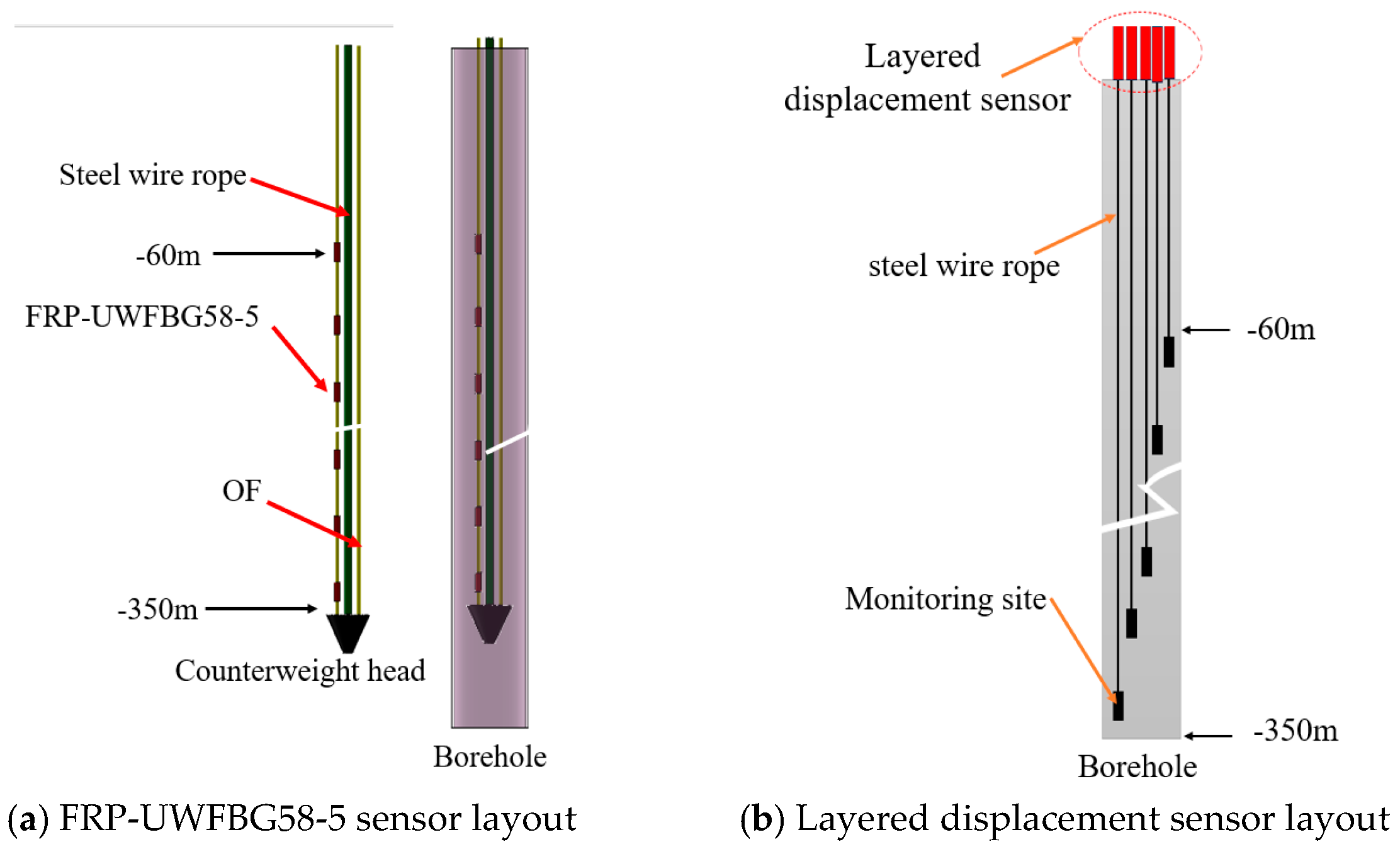 Figure 6b shows a schematic diagram of the layered displacement sensor deployment. The layered displacement sensor is actually composed of multiple cable-type displacement sensors. The first monitoring points of the FRP-UWFBG58-5 sensor and layered displacement sensor were located 60 m below the surface.