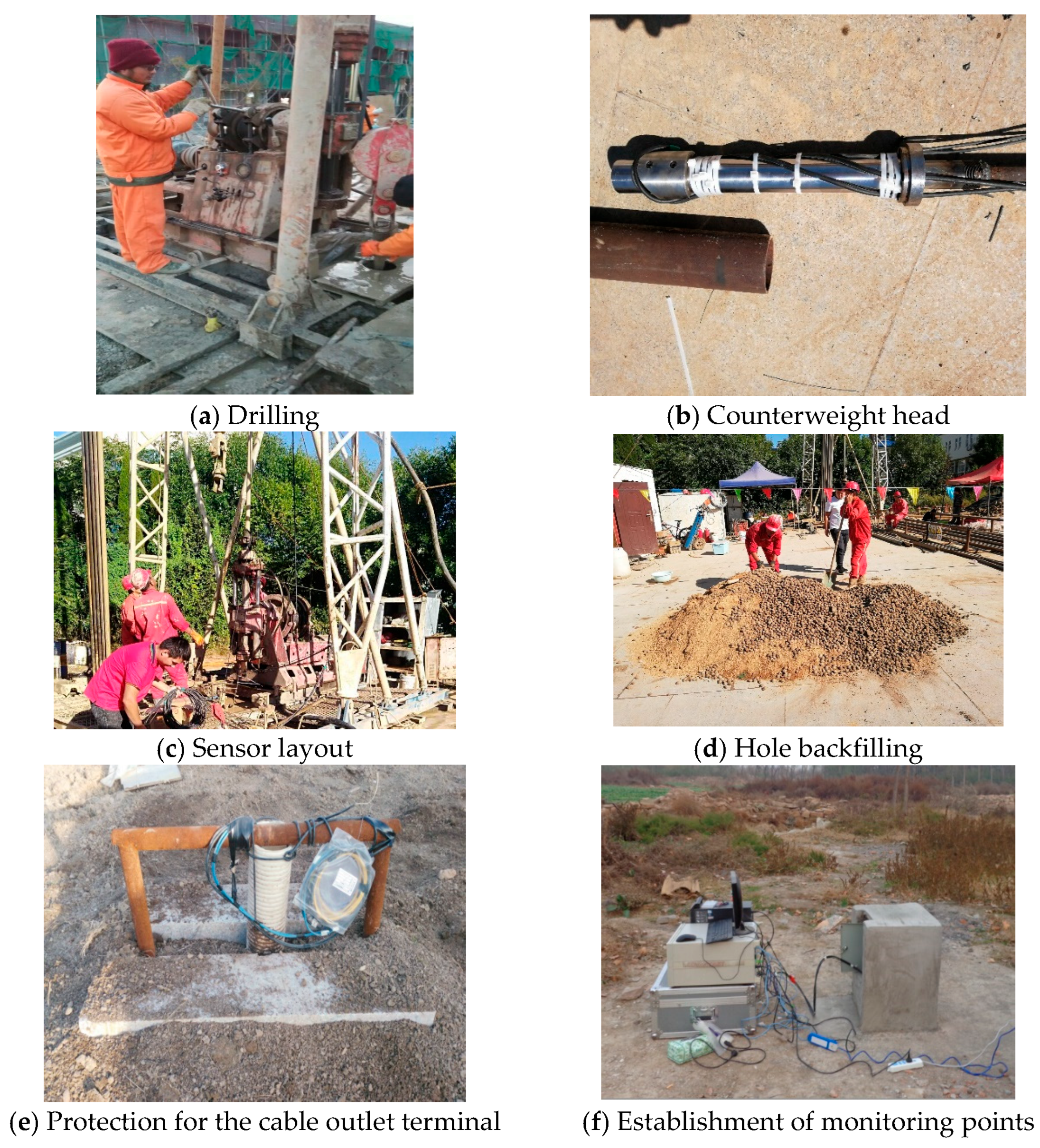 Figure 8 shows photographs of the sensor field deployment. The installation process comprises six steps: drilling, counterweight head installation, sensor deployment, borehole backfilling, sensor cable end protection, and monitoring station establishment. The mass of the counterweight head is 1000 g. The FRP-UWFBG58-5 sensor, optical fiber (OF), and steel wire rope are secured to the counterweight head, ensuring the sensor remains in a straight line at all times. Based on long-term underground temperature observation data, temperatures at depths ranging from 46 to 500 m below the surface remain largely unaffected by seasonal temperature fluctuations and are essentially constant. Therefore, this monitoring plan does not include the installation of temperature sensors for environmental temperature compensation. Furthermore, when the length of the FRP-UWFBG58-5 sensor reaches 350 m, multiple UWFBG sensors detect the same temperature field within a certain range, and since at least one UWFBG sensor is not affected by soil deformation, this sensor can serve as a temperature sensor to compensate for the temperature of other sensors.
