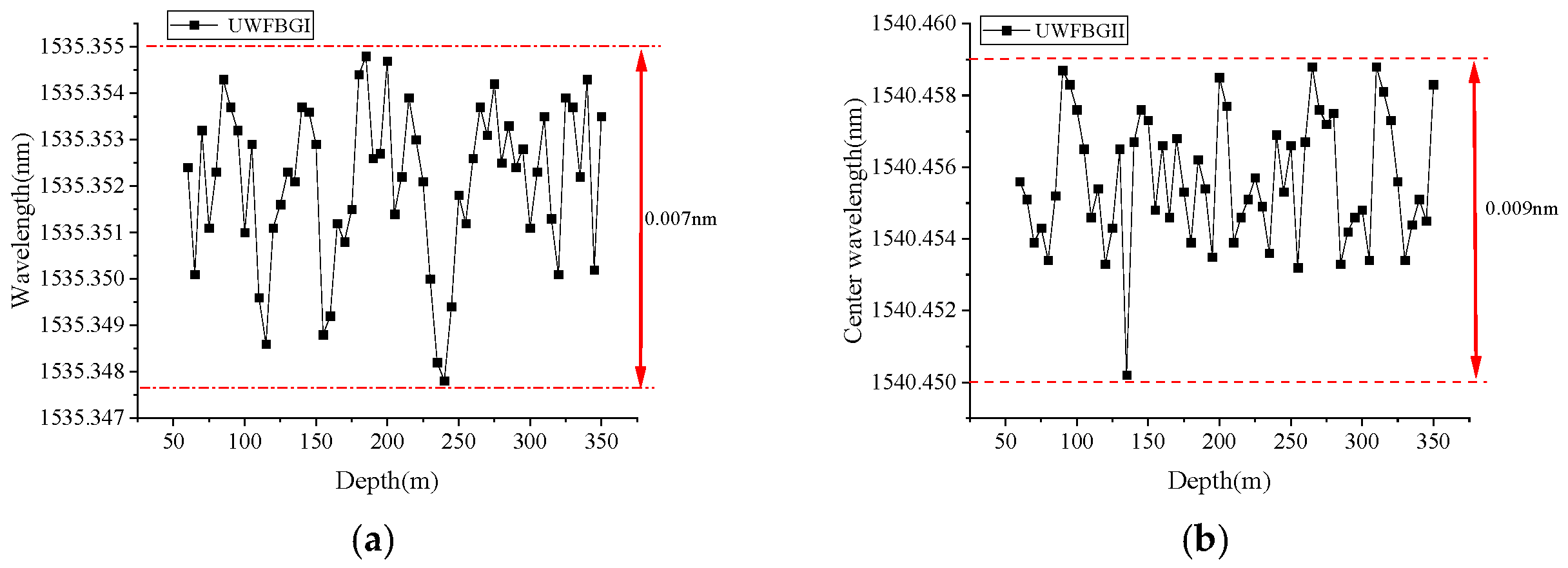 Figure 9 shows the center wavelength distribution of the two ultra-weak FBG arrays in the FRP-UWFBG58-5 sensor; it can be seen that the center wavelengths of the fiber gratings within each weak-light fiber grating array are essentially identical, with the UWFBGI array having a center wavelength range of [1535.3476 nm, 1535.3551 nm] and the UWFBGII array having a center wavelength range of [1540.4503 nm, 1545.4592 nm].