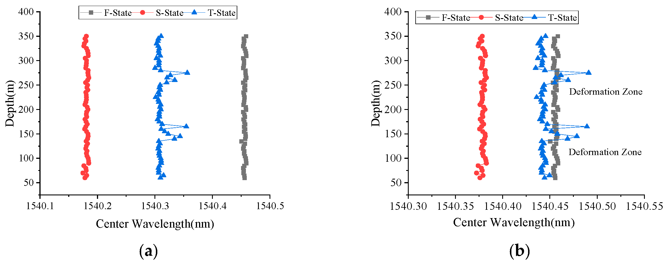 Figure 11 show the center wavelength distribution of the ultra-weak FBGs in the FRP-UWFBG58-5 sensor before and after temperature compensation at three different states. The first state (named as F-State) is when the sensor was outdoors in a free state and the outdoor ambient temperature was 32.3 °C; the second state (named as S-State) is when the FRP-UWFBG58-5 sensor was installed into the borehole, and the borehole was not backfilled, and the borehole temperature was 20.7 °C; and the third state (named as T-State) is at twenty-four hours after backfilling the borehole and the temperature inside the hole was 24.4 °C. Here, traditional resistance temperature detectors such as the PT100 are used for ambient and borehole temperature measurements.