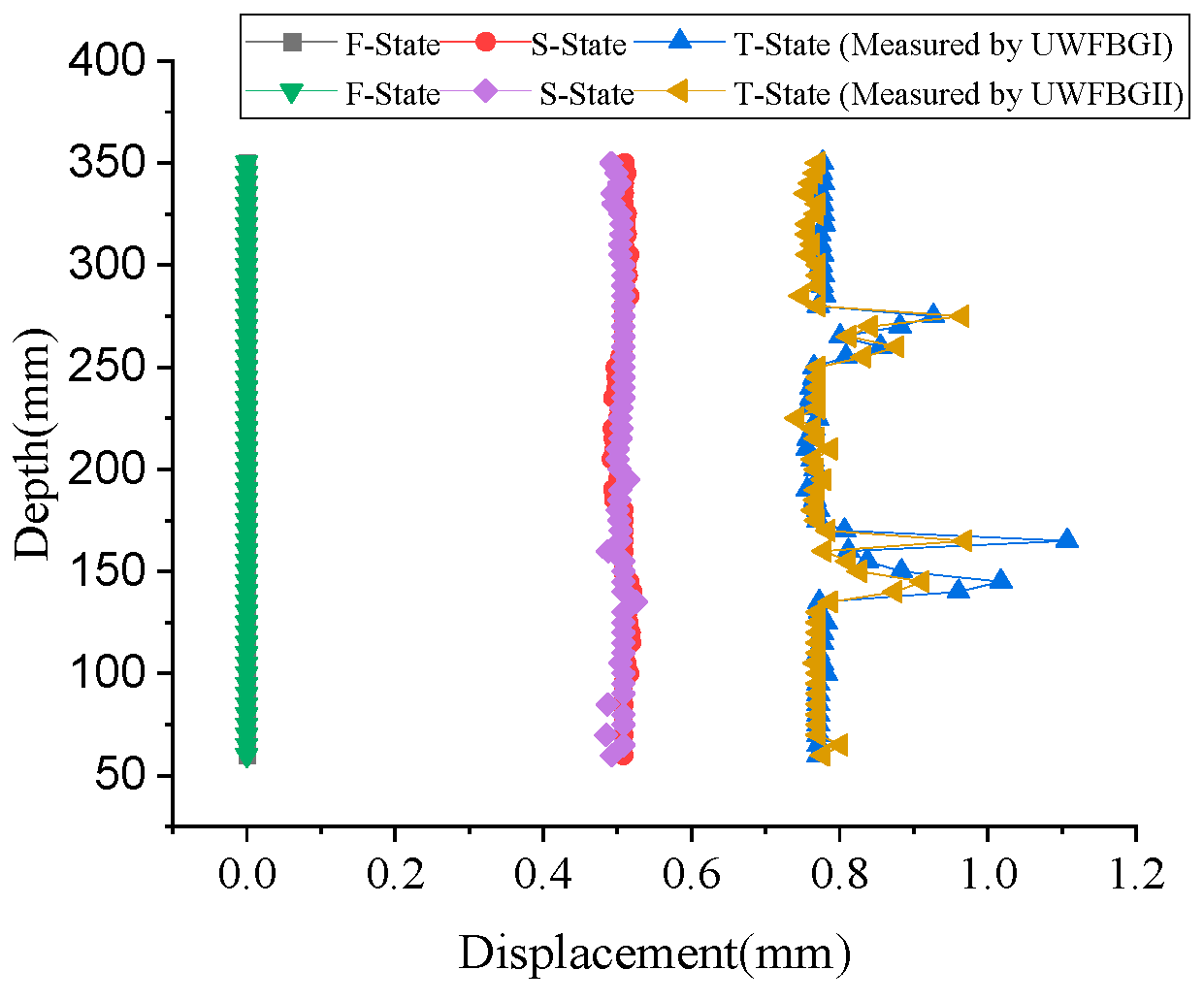 Figure 12 shows the displacement distribution measured by the FRP-UWFBG58-5 sensor. The displacement (