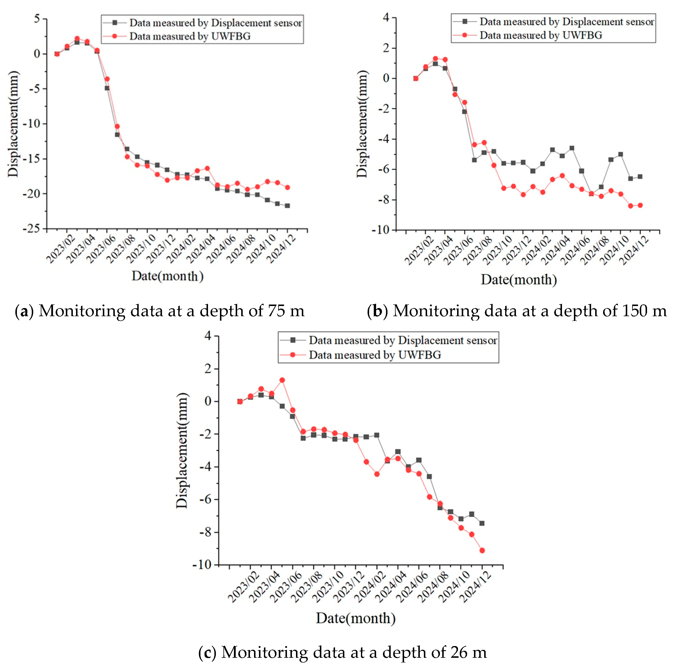 Figure 13 shows the displacement comparison curves. Monitoring data from the FRP-UWFBG58-5 sensor and layered displacement sensor both indicate that from January to March in 2023, the strata were in a rebound state with settlement rates tending to decrease. After May in 2023, the strata entered a compression state, with settlement rates gradually increasing. The trends observed in the monitoring data from the FRP-UWFBG58-5 sensor and layered displacement sensors were largely consistent. The final settlement values measured by the layered displacement sensor are −21.67 mm, −6.48 mm, and −6.45 mm at the 75 m, 150 m, and 265 m locations, and those measured by the FRP-UWFBG58-5 sensor are −19.07 mm, −8.35 mm, and −9.10 mm as listed at the 75 m, 150 m, and 265 m locations in