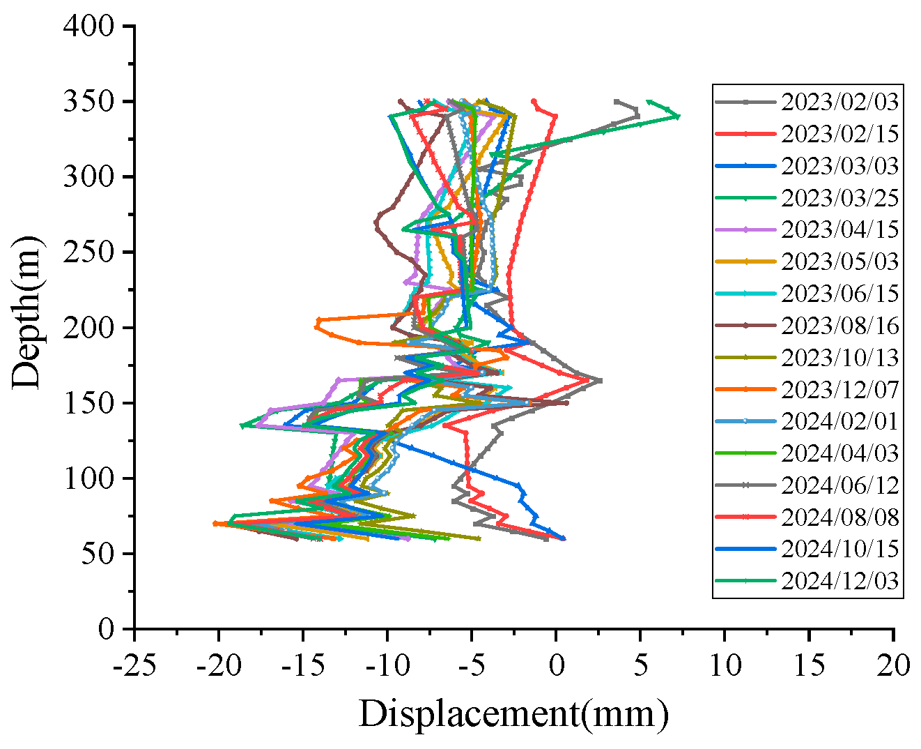 Figure 14 shows the distribution of deep soil displacement from February 2023 to December 2024, with sampling points spaced at 5 m intervals measured by the FRP-UWFBG58-5 sensor. Overall, the test results above indicate that both the layered displacement sensor and the FRP-UWFBG58-5 sensor demonstrate high accuracy in fitting stratum deformation patterns, both capable of intuitively and accurately reflecting soil deformation characteristics. The unique advantage of the ultra-weak FBG array lies in its ability to characterize stratum changes across the entire pore space and cross-section, enabling analysis of deformation patterns at any stratum level.