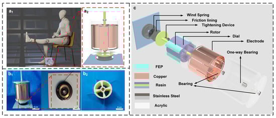 (a1) MSTKJS-TENG in use, (a2) frontal 3D view of MSTKJS-TENG, (b1,b2) photographs of MSTKJS-TENG, and (c) exploded 3D rendering of MSTKJS-TENG.
