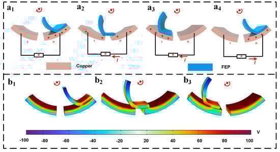 Figure 2 illustrates enlarged images of MSTKJS-TENG’s copper electrodes and FEP tabs alongside its corresponding electrical generation principles. When MSTKJS-TENG reaches the starting state as displayed in Figure 2(a1), FEP contacts Copper Electrode II. Based on the electronegativity order list, FEP possesses greater electronegativity than copper, causing the former to acquire a negative charge and the latter a positive charge upon contact. As the membrane moves to its position in Figure 2(a2), it lies between Copper Electrodes I and II, with a constant overall quantity of negatively charged particles remaining on the surface, resulting in some positively charged particles moving onto Copper Electrode I. Due to charge displacement leading to current flow, as the FEP membrane moves towards its position shown in Figure 2(a3), full contact occurs between it and Copper Electrode I. Maintaining the same principle, as the net quantity of negative charges on the FEP membrane stays constant while still generating consistent current, the membrane again contacts Copper Electrode II when transitioning to its position, as seen in Figure 2(a4). When arranging the electrodes as differential electrode pairs, designers allow opposing current directions between Figure 2(a2,a3) and later phases of contact with Copper Electrode II upon membrane repositioning. Figure 2(a1–a4) illustrates one complete cycle of motion within MSTKJS-TENG’s energy-generating unit, generating a sinusoidal alternating voltage signal useful for subsequent sensing purposes. COMSOL Multiphysics 6.0 software simulation results presented in Figure 2(b1–b3) demonstrate potential differences in contact positions between the two materials, providing effective simulation support for theoretical analysis during later stages of development.