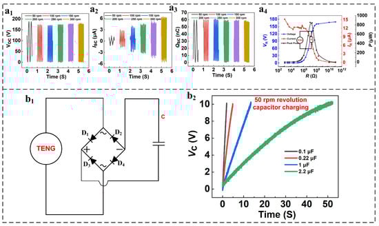 (a1–a3) Voltage, current, and charge waveforms across varied RPM ranges, (a4) power/voltage/current trends, (b1) circuit diagram depicting capacitor charging process, and (b2) voltage profiles demonstrating recharge patterns among 50 RPM/Capacitance configurations.