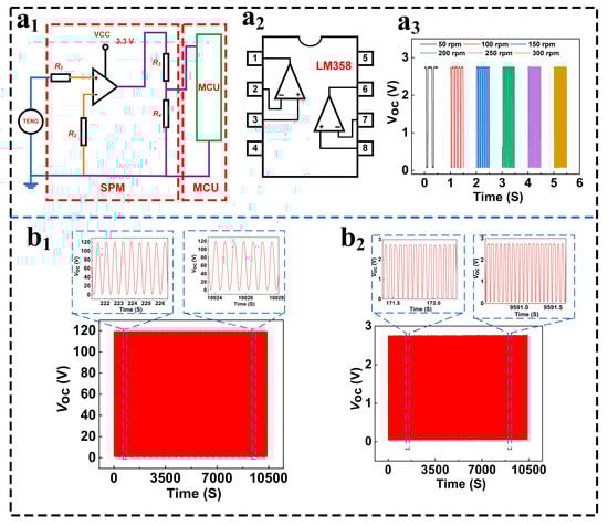 (a1) Schematic of Signal Processing Module, (a2) square wave voltage profiles for varied RPM ranges, (a3) output signals at different rotational speeds and endurance voltage waveform charts featuring MSTKJS-TENG vs. (b1,b2) converted square wave signals.