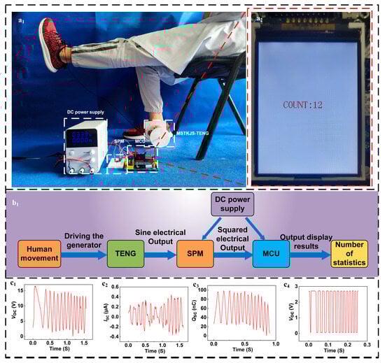 (a1,a2) MSTKJS-TENG actual application diagram, (b1) MSTKJS-TENG principle flowchart, (c1–c3) MSTKJS-TENG actual use TENG external output parameters, and (c4) MSTKJS-TENG actual use TENG external output after Signal Processing Module outputs square wave signal.