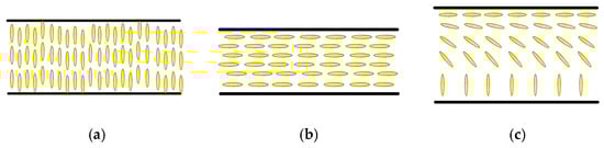 The performance of LC sensors is further significantly influenced by the anchoring conditions at the interfaces. Thin film sensors often use substrates treated with alignment layers to control the initial orientation of LC molecules with the different types of alignment shown in Figure 2. The interaction of analytes with the substrate or the LC itself alters these anchoring conditions, resulting in measurable shifts in molecular orientation. For example, biosensors based on LCs can detect the binding of biomolecules (e.g., proteins or DNA) through changes in surface anchoring energy, which induces observable texture changes in the film under polarizing optical microscopes (POMs) [3,4,5,6,7].