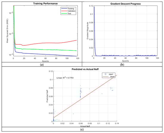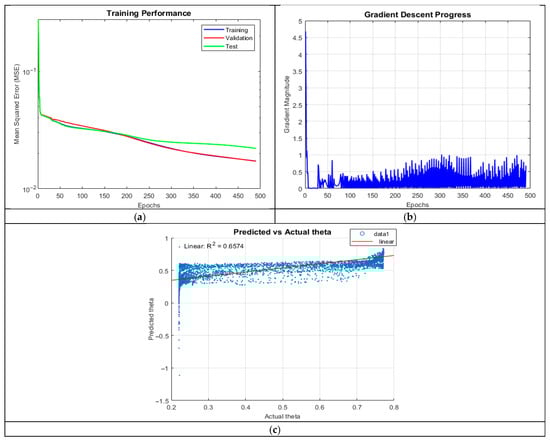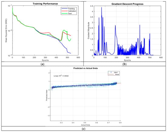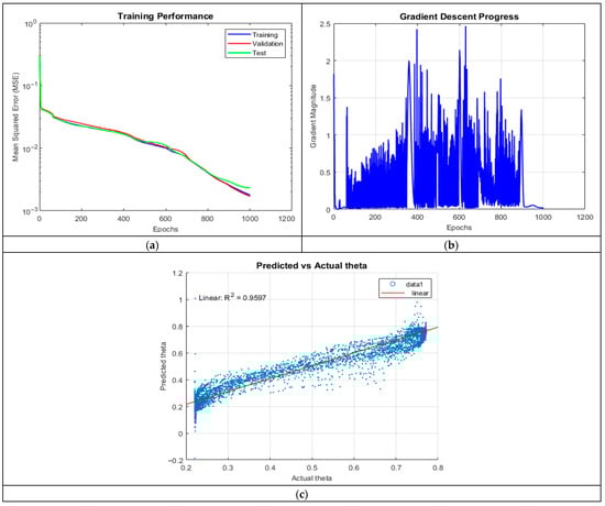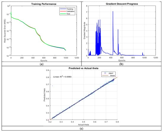 The MSE over epochs plot in Figure 9 shows a rapid decrease in error during the initial five epochs, reflecting efficient early-stage learning. However, beyond this point, the validation MSE begins to diverge from the training MSE, indicating overfitting. By the end of training, the final MSE values were 1.1589 × 10−4 (training), 2.7179 × 10−4 (validation), and 1.8384 × 10−4 (test). The gradient magnitude plot further supports this observation, showing a sharp initial decline followed by minimal subsequent updates. This behavior suggests that while the network initially adapts quickly, it reaches a local minimum where further optimization yields diminishing returns.