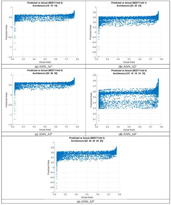 Additionally, increasing the number of neurons or hidden layers did not substantially improve performance under cross-validation. Although the 20-20-20-20-20 architecture exhibited the highest mean R2 (0.4077), the improvement was marginal and insufficient to compensate for the reduced training data per fold. This suggests that deeper architectures may be prone to underfitting in K-fold settings due to the higher number of parameters and reduced sample availability. Overall, the cross-validation experiments demonstrate that while the TrainLM networks achieved high accuracy, their generalization capability is limited. The K-fold SCG results emphasize the importance of cross-validated training and indicate that additional data or alternative regularization strategies may be required to develop more robust predictive models for θ.