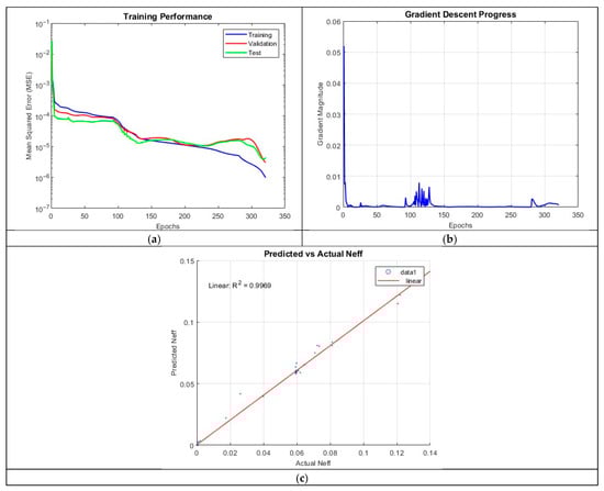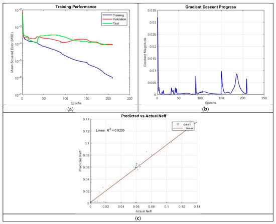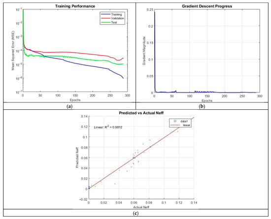 Training outputs of ANN_B5: (a) performance measuring the MSE; (b) magnitude of the gradient through training; (c) comparison between the predicted and actual values.