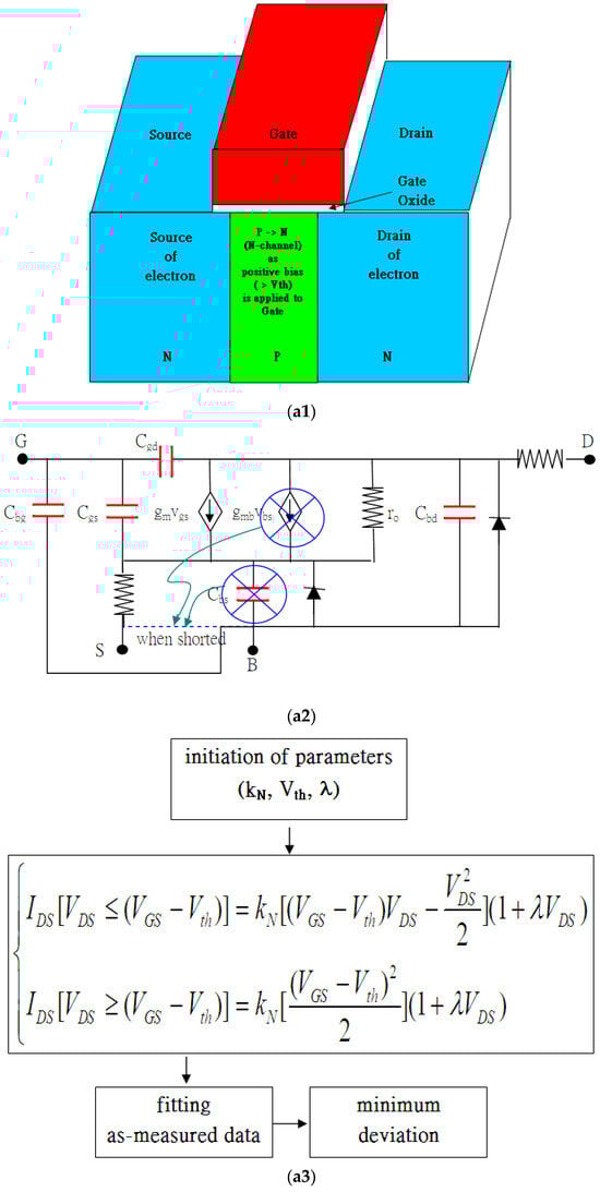 This study is based on the mechanism that, in NMOSFET (transistors using electrons as carriers for signals or power), n-p-n may become n-n-n-conductive due to the strong inversion layer. Conventional current–voltage formulas for this transistor use (kN, Vth, λ) as the basic parameters to further build up a sophisticated model like BSIM4 (simulation manual generated by UC Berkeley). BSIM4 facilitates itself with many equivalent circuits and, thus, introduces many other physical parameters, e.g., as shown in Figure 1(a1–a3). In Figure 1(a2), ro (IoλVDS = VDS/ro) is added to address the leakage current between the Drain and the Source in the saturation regime. Somehow, the triode regime shares the equivalent ro as well. From the continuous point of view, the two proposed formulas, including the triode regime and saturation regime, are supposed to be continuous at VDS = (VGS − Vth). Therefore, the conventional formulas modified by adding (1 + λVDS) in the triode regime are mandatory. On the other hand, the term (1 + λVDS) does address the leakage current and shall be reasonably taken into account in the triode region as well [1]. Somehow, Vth may vary as the short-channel effect and drain-induced barrier lowering are considered. As in Figure 1(a2), some equivalent capacitors, such as Cgs or Cgd, show open circuits unless the input frequencies are high enough. Also, gm (trans-conductance) plays a crucial role, as observed in the slope of IDS-VGS, which shows the optimization of an amplifier on the voltage gain. Many other parameters include Gm in the slope of IDS-VDS characteristics, making equivalent passive devices for the feasibly continuous feature. As the two-port network is considered in Figure 1(a2), the h21 (short-circuit current gain) and S22 (output reflection coefficient, gm) are comparatively considered, where kinks are found [2].