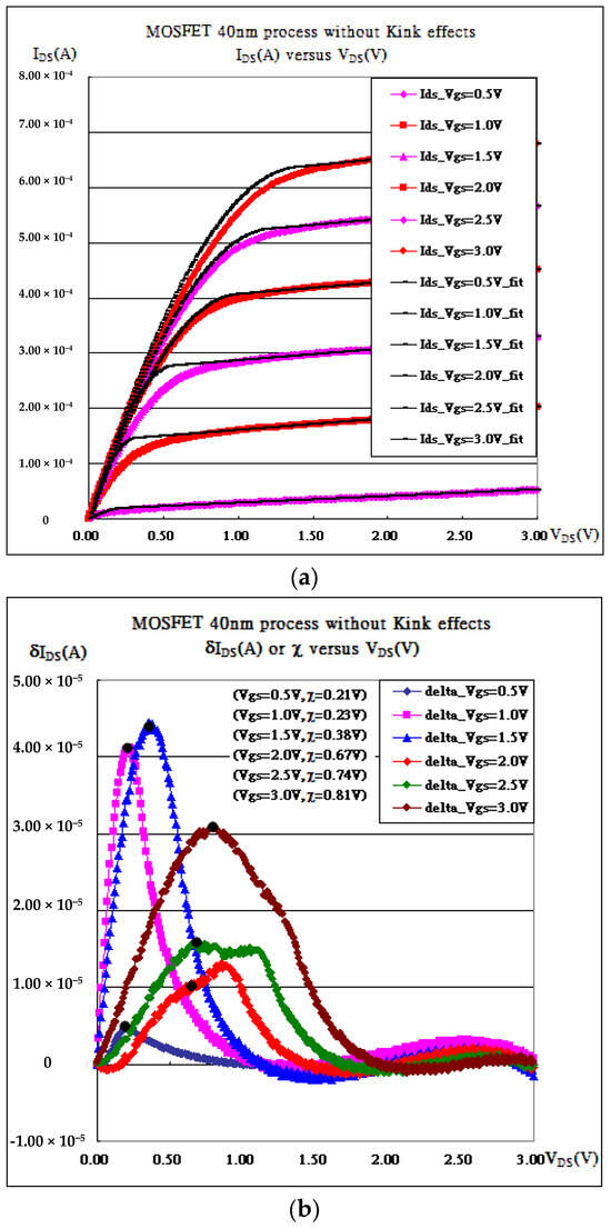 which approaches Gaussian, and so is the EM radiation [19,20,21]. The maximum speed of the current always happens at the saturation regime, while the maximum variation occurs somewhere in between VDS = 0 and VDS = (VGS − Vth). The maximum variation in the speed of the carriers corresponds to the maximum variation in J = nev. It, thus, radiates a maximum EM wave, agitating more lattice vibrations (quantized as phonons), which result in more phonon scattering. Phonon scattering is, thus, responsible for the Source–Drain current reduction at around VDS = (VGS − Vth) [19,20,21]. The kinks are defined to be the maximum deviation in the fitting data and the as-measured data and are almost linearly proportional to VDS = (VGS − Vth). Indeed, the reliable model must be based on the fitting with minimum deviations, and the root mean square really helps. The generated model is, thus, facilitated to design an integrated circuit (IC).