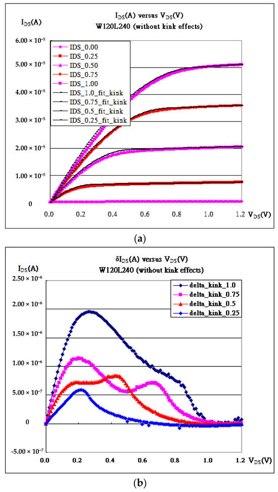 Moreover, kink effects are introduced as in Equation (7), with extra parameters (α, β, χ)kink. Kink effects may happen simply because the most accelerated carriers in the triode region emit a lot of photons running ahead, vibrating the lattice, causing obstacles, and reducing the speed of the carriers themselves.