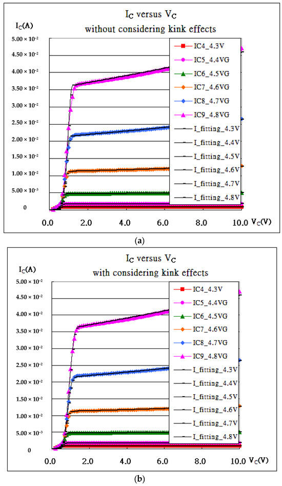 As shown in Figure 1c and Figure 5, the fitting in Figure 5b is always superior to that in Figure 5a for the kink effects (the radiation by accelerated charges), and bulk effects join the fitting. Bulk effects, taking the same form as kink effects but with a positive sign, address the heat coming from the bulk and accelerating the carriers. Figure 5(c-1a–1c) (VGS = 4.7 V) and Figure 5(c-2a–2c) (VGS = 4.8 V) show the extra improvements in the fitting as referred. All extracted internal parameters are listed in Table 3.