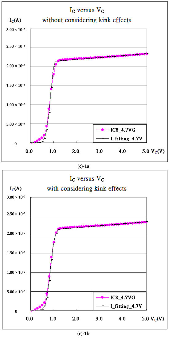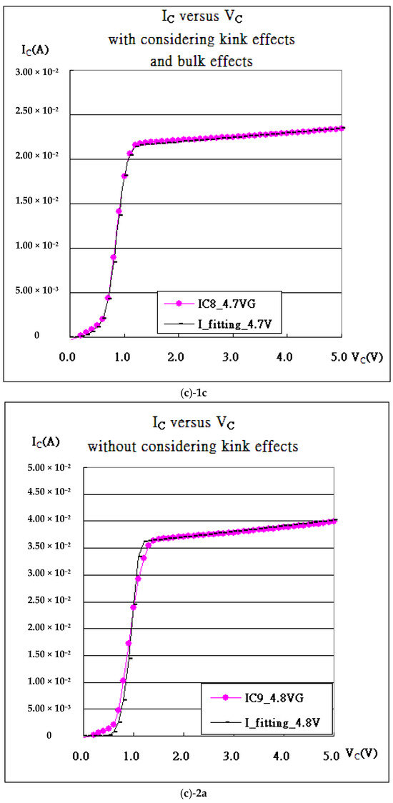 (a) The characteristic curves, ICE-VCE, and their fitting for IGBT in Equation (8). (b) The characteristic curves, ICE-VCE, and their fitting for IGBT considering kink effects. (c-1a) VG = 4.7 V without considering kink effects, (c-1b) VG = 4.7 V considering kink effects, (c-1c) VG = 4.7 V considering kink effects and bulk effects, (c-2a) VG = 4.8 V without considering kink effects, (c-2b) VG = 4.8 V considering kink effects, and (c-2c) VG = 4.8 V considering kink effects and bulk effects.