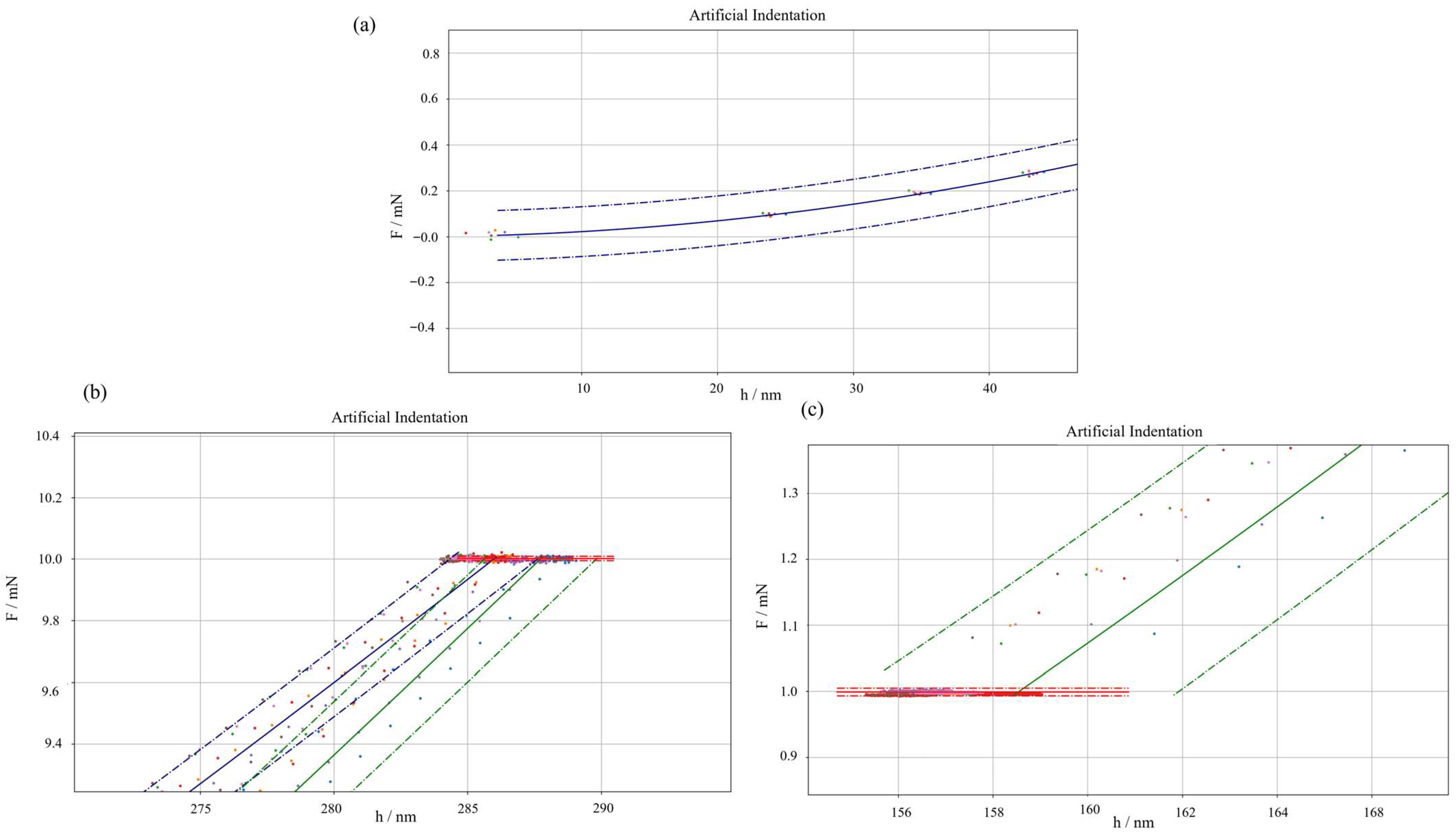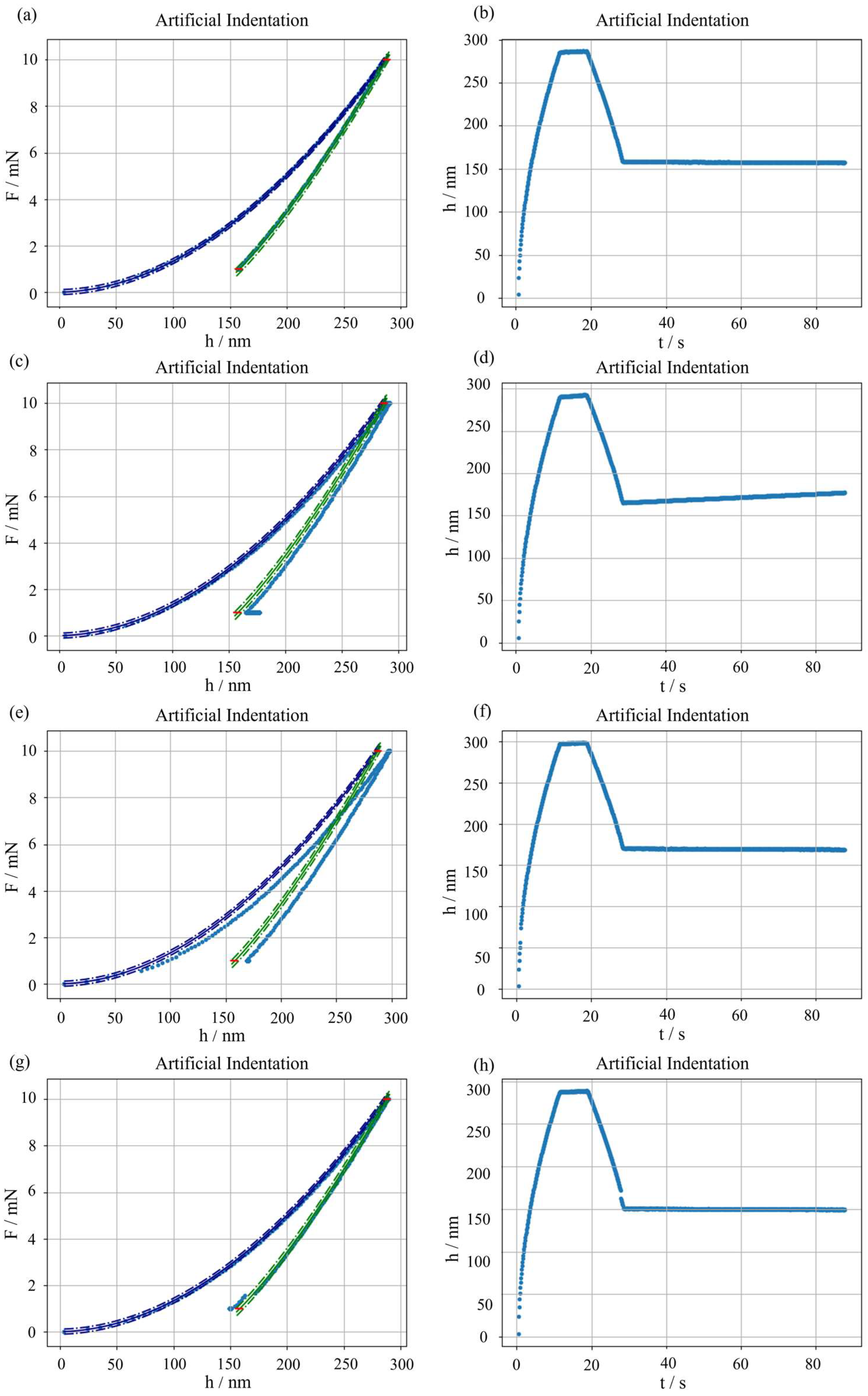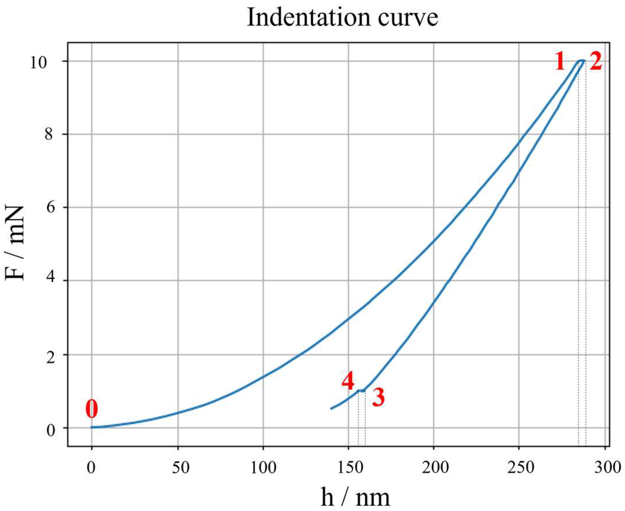2, having the Young modulus of (73.0 ± 0.5) GPa and Poisson’s ratio of 0.163 ± 0.002. Indentations implemented a force-controlled indentation cycle with a maximum force of 10 mN, and duration of loading, primary holding, and secondary holding (at 10% of