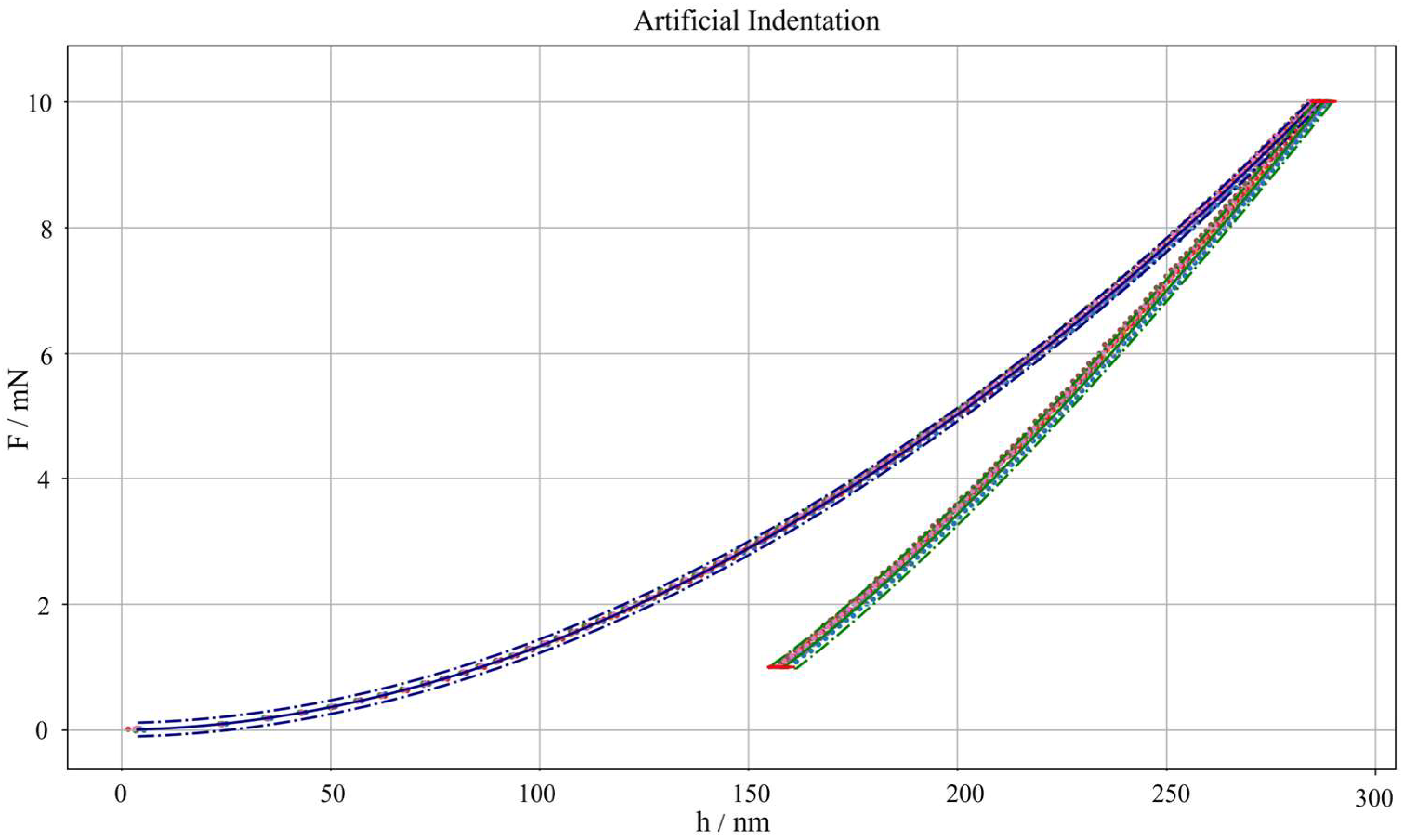 Synthetically generated quantities are obtained by sampling from underlying statistical distributions. Accordingly, it is possible to estimate the uncertainty of the synthetic indentation curve. The loading and unloading segment uncertainty evaluation leverages the law of propagation of uncertainty (LPU) [