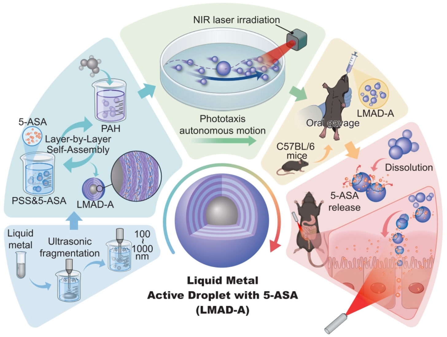 Photothermal-driven targeted drug release by nanocarriers at inflammatory sites offers a promising strategy for colonic diseases. Unlike other photothermal nanoparticles, LMAD-A leverages liquid metals’ broad absorption, enabling low-power actuation for deformation and fusion in biological systems. Gallium oxidation and droplet deformation synergistically enhance drug release, and gallium ions released from the liquid metal suppress bacteria and reactive oxygen species at inflammatory sites, aiding colitis treatment in mice. Colloidal motors located in the intestines or bladder remain confined to the lumen without systemic exposure [
