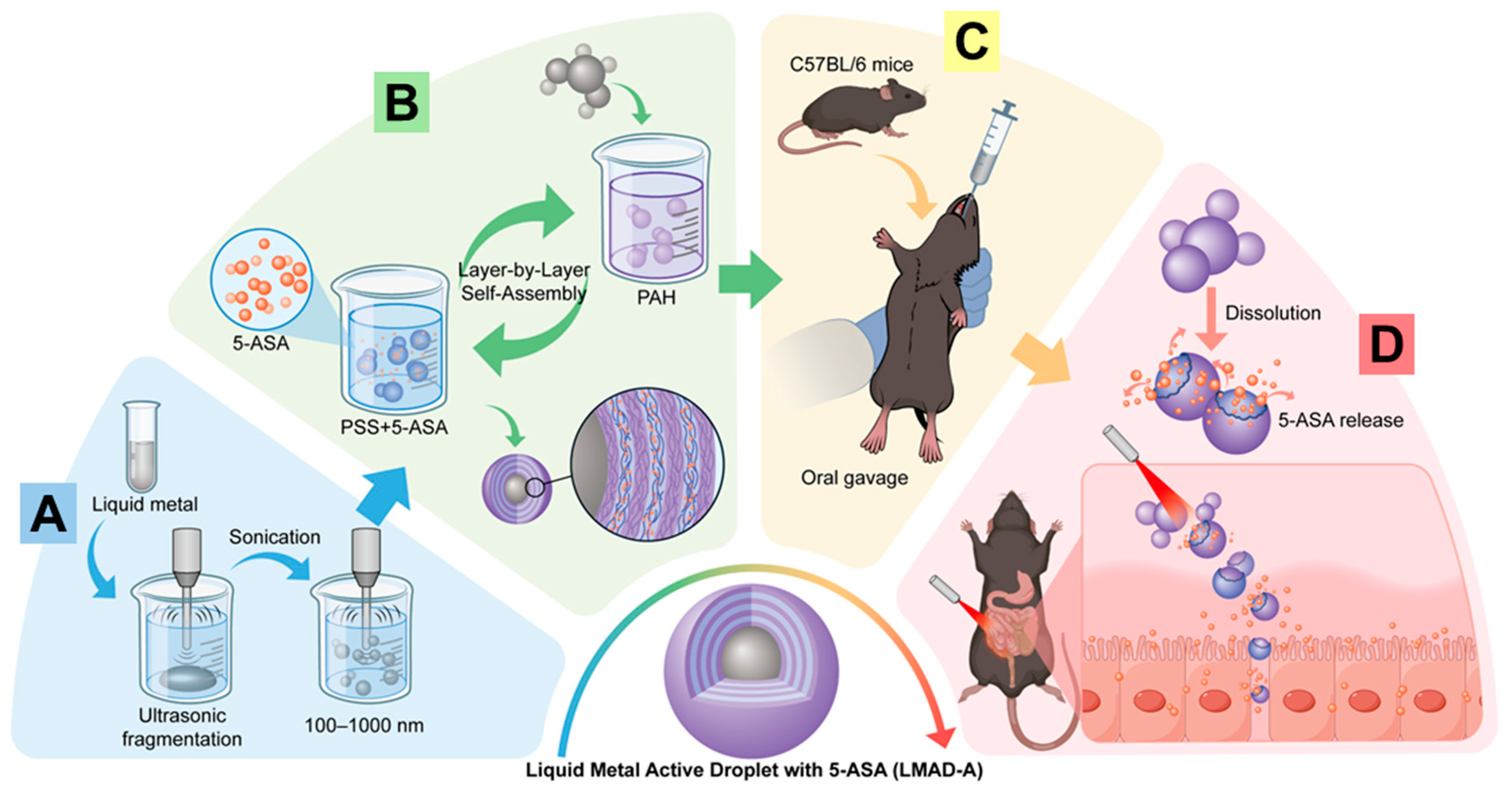 EGaIn alloy was purchased from Hunan Zhongcai Shengte New Materials Technology (Changde, China), PAH and PSS were purchased from Sigmaaldrich (Darmstadt, Germany), 5-ASA and anhydrous ethanol was purchased from Innochem (Beijing, China). Deionized water was produced by a Milli-Q pure water system.