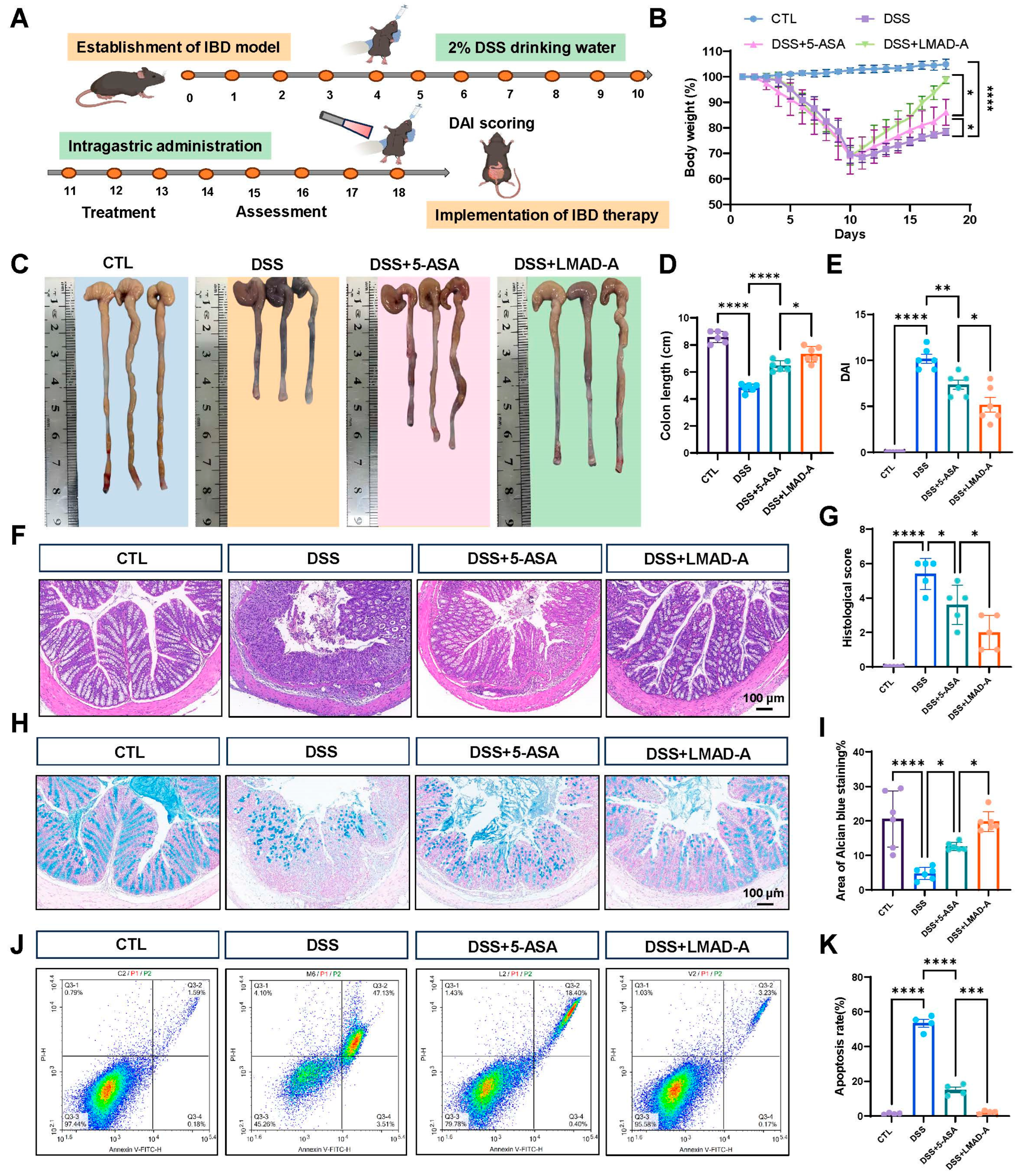 Figure 5J,K) demonstrated that DSS treatment significantly increased the proportion of apoptotic epithelial cells, as shown by an increased percentage of cells in the upper right quadrant. 5-ASA treatment reduced the number of apoptotic cells, and this anti-apoptotic effect was further strengthened by the combination with LMAD-A. In summary, these results demonstrate that, compared to 5-ASA treatment alone, the combination of with LMAD and 5-ASA significantly alleviates DSS-induced colitis in mice and further enhances the therapeutic efficacy of 5-ASA.