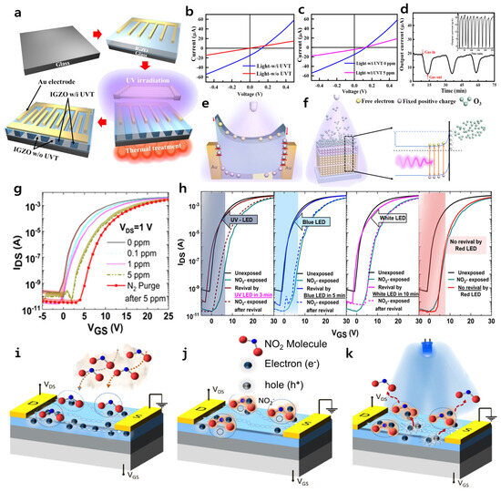 (a) Schematic illustration of the manufacturing procedure for self-powered O₃ gas sensor fabrication. (b) I–V characteristics under UV illumination (25 mW/cm2) at 0 V bias for gas sensors with and without UVT. (c) Illuminated I–V characteristics for a gas sensor with UVT in the presence and absence of 5 ppm O₃ gas. (d) The gas response characteristics under continuous UV illumination (25 mW/cm2) at 0 V during repeated exposure to 5 ppm O₃ gas. (e) Energy band diagrams of a sensor exhibiting an asymmetrical Schottky barrier height at 0 V, shown under UV illumination. (f) Schematic diagram depicting the adsorption process under UV illumination, along with the energy band interaction with O₃ molecules at the surface. Reproduced with permission. Ref. [57] Copyright 2022, American Chemical Society. (g) Gas response characteristic of IGZO TFT-based sensors after 3 min of exposure to NO2 concentrations ranging from 100 ppb to 5 ppm. (h) The gas response characteristics of IGZO TFT-based gas sensors exposed to NO2 show recovery under illumination from various commercial LEDs of different wavelengths, using the UV LED (400 nm) for 3 min, the blue LED (450 nm) for 5 min, and the white LED for 10 min, but no recovery occurs after 15 min with the red LED (635 nm). A schematic diagram of the sensing and revival mechanisms: (i) adsorption of NO2 molecules, (j) depletion of surface charge carriers, and (k) the device revival mechanism under LED illumination. Reproduced with permission. Ref. [29] Copyright 2020, American Chemical Society.