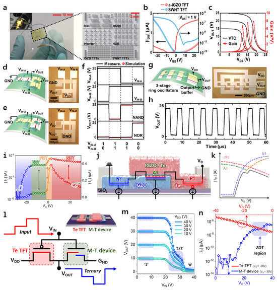 (a) An optical image of layered photosensitive complementary logic circuits on a PI substrate and optical image of the logic circuit demonstrated with IGZO and SWNT TFTs IGZO. (b) Transfer curves of IGZO and SWNT TFTs. (c) Complementary inverter characteristics for VDD applied from 15 V to 25 V and voltage gain at VDD = 25 V of the complementary inverter. Schematic diagram and an OM image of (d) NAND and (e) NOR logic circuit. (f) Input and output signals (VIN-A, VIN-B) based on IGZO and SWNT TFT-based NAND and NOR logic circuits. (g) Schematic diagram and optical microscope image of demonstrated ROs and (h) output signal from the ROs. Reproduced with permission. Ref. [32] Copyright 2021, Wiley-VCH GmbH. (Reprint by permission of John Wiley & Sons). (i) Transfer curve of the M-T device at different gate bias voltages. (j) Equivalent circuit model schematic diagram with the Te TFT, IGZO TFT, and Te/IGZO TFT components. (k) Schematic diagram for explaining the current characteristics of the M-T device. Complementary ternary logic circuit based on M-T device of (l) schematic circuit diagram and (m) VTC curve. (n) Transfer curve depicting the performance of the Te TFT and the M-T device in the ternary inverter. Reproduced with permission. Ref. [79] Copyright 2024, American Chemical Society.