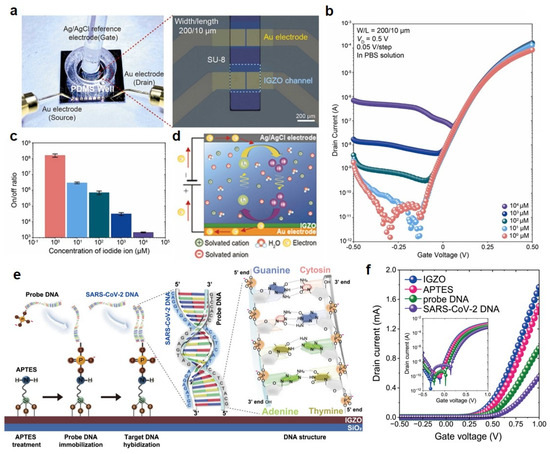 For sensing iodide ions, Park et al. demonstrated electrolyte-gated thin-film transistors (EGTFTs) using IGZO based on a sol–gel process [97]. Figure 4a shows a photograph and OM image of the IGZO-EGTFTs. An Ag/AgCl reference electrode for applying the gate bias voltage was placed in the electrolyte solution confined in a polydimethylsiloxane (PDMS) well. In addition, the whole area except for the IGZO channel region was passivated using SU-8 2000. Figure 4b exhibits the changed electrical properties dependent on the iodine ion concentration in the phosphate-buffered saline (PBS) solution. The concentration of the detected iodine ions was from 1 μM to 104 μM, and the off-current in the transfer curve gradually increased as the ion concentration increased. In particular, the off-current of the proposed device at 1 μM iodine ions achieved 1.61 × 108 and decreased to 2.14 × 103 at 104 μM. This indicates that the on/off ratio decreases as the concentration of iodide ions increases due to the increased off-current (Figure 4c). In addition, the calibration curve of the ID at the optimized VG of −0.3 V has a high linear sensitivity with an R2 value of 0.992. Also, the electrical properties of the proposed biosensor are explained through the charge transfer behavior at the interface (Figure 4d). As the iodine ion concentration in the electrolyte solution increases, the redox ions diffuse at the IGZO and electrolyte interface, lowering the interfacial resistance and increasing the ID in the transfer curve.