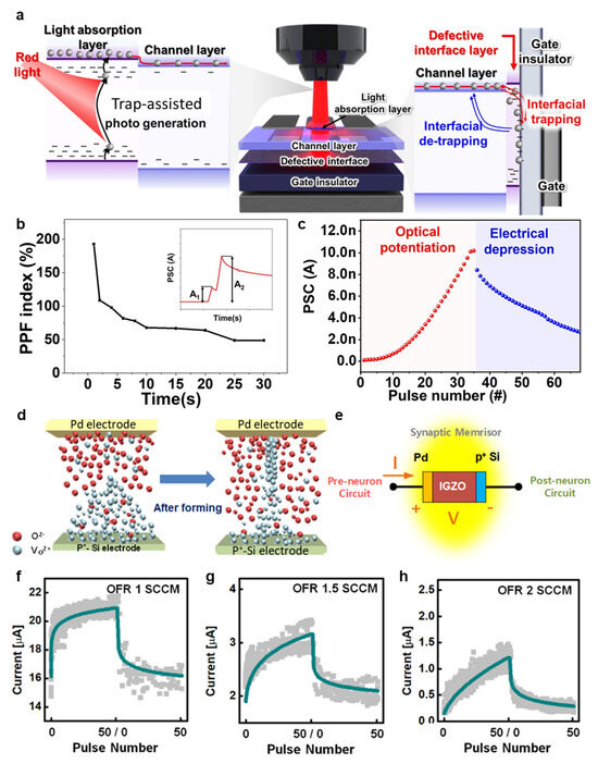 Kim et al. demonstrated a transistor that absorbs red light at 635 nm and performs synaptic functions by controlling defects in IGZO [116]. The proposed device consists of a double-layer IGZO structure. First, a defect interface layer created through sol–gel synthesis has a certain amount of surface dangling bonds and trap sites due to precursor decomposition and solvent evaporation. Then, a channel layer that controls the switching characteristics in response to light signals is continuously deposited using a sputtering method. The light-absorbing layer is annealed at 200 °C to expand the region to the visible light absorption band. Compared to the channel layer, the light-absorbing layer has enhanced oxygen defects due to increased VO and –OH, creating sub-gap states that improve light absorption. Therefore, the transfer curve of the proposed device shows the conventional n-type transistor behavior, showing a negative shift in Vth and an increase in photocurrent with red light irradiation. Figure 5a shows the band diagram and the synaptic operation mechanism of the proposed device. The carriers photogenerated by red light irradiation are trapped between the dielectric gate and the channel, which is a defective interface layer due to the gate bias. The defective interface layer increases the speed of trap and de-trap of the photogenerated carriers, enhancing the persistent photoconductance (PPC), and improving the postsynaptic current (PSC) and gain with the increased amount of photogenerated carriers in the light-absorbing layer. Figure 5b shows the paired pulse facilitation (PPF) index of the subsequent signal generated in the postsynaptic neuron by repeated stimulation in the proposed device. When the red light pulses with the shortest interval (t = 1 s) are irradiated, the PPF shows a maximum of 198% and decreases as the interval increases. Figure 5c shows the PSC characteristics in the proposed device, showing the photo-induced potential and electrical depression.