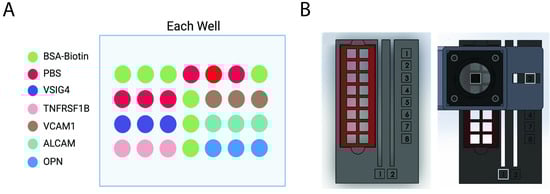 Each well of the BMA slide consists of five printed capture antibodies, anti-VSIG4, anti-TNFRSF1B, anti-VCAM1, anti-ALCAM, and anti-OPN (Figure 2A). The slides were prepared using a non-contact microarray printing robot (sciFLEXARRAYER S3; Scienion GmbH, Berlin, Germany), which printed capture antibodies for each biomarker in triplicate at a controlled drop volume of 450 ± 20 pL. The printing process utilized a PDC90 needle (Scienion GmbH) and was conducted at 25 °C with a relative humidity of 60%. Following printing, the slides were left to dry overnight within the printing chamber and subsequently assembled with SecureSeal Hybridization Chambers (Grace Bio-Labs, Bend, OR, USA). Each slide consisted of 16 identical arrays, with the chambers designed to isolate individual arrays and prevent cross-contamination between samples. The assay protocol used for this array followed previously established methods []. After drying overnight, each chamber was then blocked with 40 µL of blocking buffer at room temperature for one hour. Following this step, the blocking buffer was removed, and pre-diluted recombinant proteins or serum samples were introduced into designated wells for a two-hour incubation. The slides were then thoroughly washed, incubated with streptavidin-HRP, and subjected to additional washes before being treated with Cy3-Streptavidin to detect fluorescent signals corresponding to the printed antibodies. After adding the streptavidin-Cy3, the fluorescent signals on the slide were read at an emission wavelength of 532 nm with a Genepix 4300A microarray scanner (Molecular Devices, San Jose, CA, USA) and quantified with Genepix Pro7.0 software (Molecular Devices, CA, USA). The BMA reader was further used to compare signal results with the Genepix scanner.
