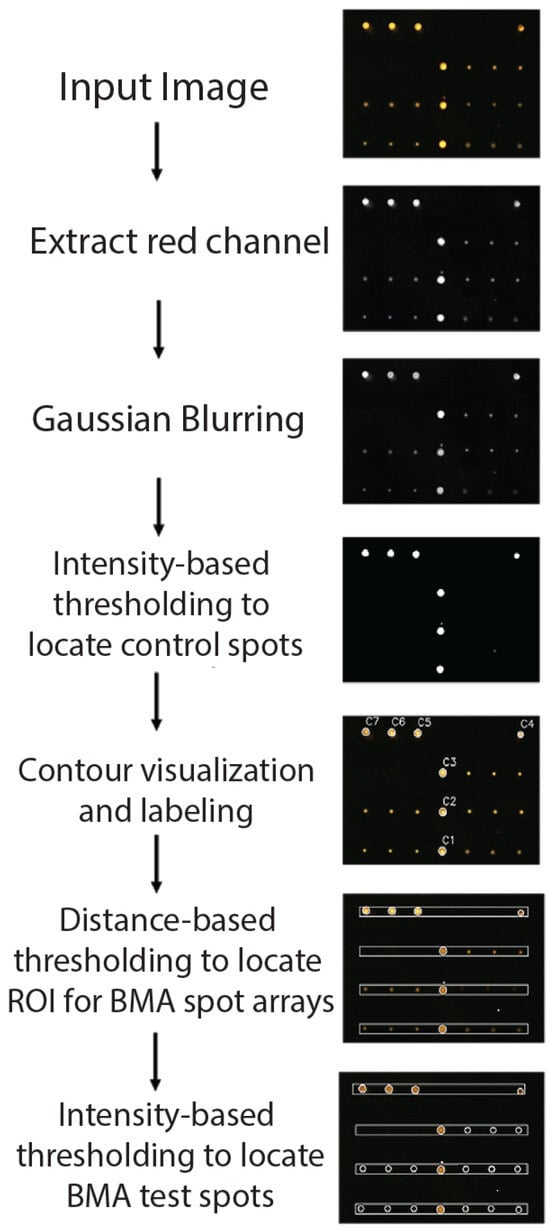 An image processing pipeline was developed to automate camera parameter control, spot detection, and intensity analysis for the BMA slide using Python (Figure 3). Fluorescence images were imported in ‘png’ format, and the red channel of the RGB images was used for analysis due to its dominant contribution to fluorescence intensity.