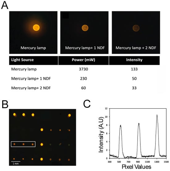 The incident power was subsequently reduced using neutral density filters (NDFs) (U-25ND25, Olympus), and the images were captured. It was found that with two NDFs, the spot is barely visible. We measured the intensity values of the same spot captured in three different configurations and found that a minimum power of 230 mW is needed to clearly visualize the mini-array spots. The light source was selected based on this information when developing the fluorescent reader. Fluorescence images confirmed that all spots on the mini-array slide were distinctly visible, and intensity profiles were generated to evaluate fluorescence signal distribution (Figure 4B). Pixel intensity peaks corresponded to individual spots (Figure 4C), showing that despite low absolute intensity values, the system achieved a high signal-to-noise ratio (SNR) sufficient to reliably distinguish spots from the background.