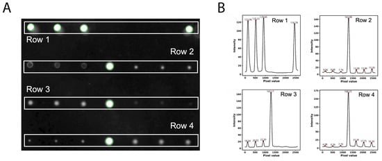 The peaks are generated by segmenting the fluorescence image into four distinct rows, with each row representing a set of printed spots (Figure 5A). Intensity profiles are created by analyzing pixel values across a defined area within each row. This segmentation ensures that fluorescence signals are isolated and evaluated independently for each row to minimize the overlap or interference between adjacent spots. Peaks in the intensity profile represent individual fluorescence signals, with the height of each peak corresponding to the fluorescence intensity of the respective spot (Figure 5B). Background pixel values are subtracted to enhance the accuracy of the measurements, ensuring that the profiles reflect only the true signal from the fluorescently labeled spots.