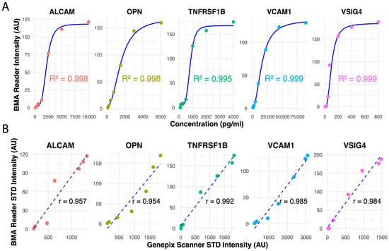 Standard curves were generated for each of the five biomarkers (ALCAM, OPN, TNFRSF1B, VCAM1, and VSIG4) using a four-parameter logistic (4PL) regression model to fit the fluorescence intensity data obtained from the BMA reader. The performance of the BMA reader was evaluated against the Genepix scanner, a widely recognized standard scanner for fluorescence microarray imaging. For the BMA reader, the curves demonstrated strong relationships between the standard protein concentrations and fluorescence intensity for ALCAM, OPN, TNFRSF1B, VCAM1, and VSIG4, with coefficients of determination (R2) of 0.998, 0.998, 0.995, 0.999, and 0.999, respectively (Figure 6A). Similarly, the Genepix scanner exhibited high R2 values of 0.986, 0.998, 0.996, 0.997, and 0.996 for the same biomarkers (Supplementary Figure S2A). The fluorescence intensity values measured by the BMA reader were directly compared to those obtained using the Genepix scanner, which serves as the reference standard for fluorescent array detection. Pearson correlation coefficients for the standard samples demonstrated strong correlation between the two platforms, with r-values of 0.957, 0.954, 0.992, 0.985, and 0.984 for ALCAM, OPN, TNFRSF1B, VCAM1, and VSIG4, respectively (Figure 6B). Representative scans for the varying concentrations of standard curves are provided in Supplementary Figure S1. Similarly, patient sample fluorescence intensities showed a strong correlation between the BMA reader and the Genepix scanner, with r-values of 0.97, 0.96, 0.93, 0.94, and 0.92 for the same biomarkers (Supplementary Figure S2C).