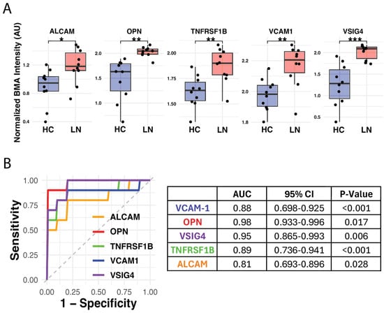 Normalized fluorescence intensity values for the five biomarkers (ALCAM, OPN, TNFRSF1B, VCAM1, and VSIG4) were compared between healthy controls (HCs) and lupus nephritis (LN) patient groups. Significant differences in fluorescence intensity were observed for all biomarkers, with LN patients exhibiting elevated levels compared to healthy controls (Figure 7A). Boxplots from the Genepix scanner (Supplementary Figure S2B) similarly demonstrated significantly elevated biomarker levels in LN patients compared to HCs. Notably, OPN and VSIG4 displayed the largest differences in normalized intensity, highlighting their potential as robust biomarkers for LN detection.