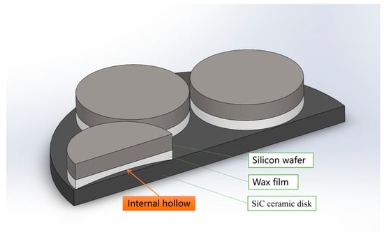 In Figure 3, five silicon wafers are attached to a SiC ceramic plate by a heated wax film. The wax film is coated on the silicon wafer and then turned and attached to the SiC ceramic substrate. In this process, a slightly convex shape will appear on all sides, and the internal hollow form will be formed after affixing. Therefore, to improve the wax-coated adhesion state, that is, to change the adhesion boundary conditions of the silicon wafer, it can be flatter and tend to follow the fixed support boundary conditions that, as per the calculation results, reduce the deflection. The closer the deflection is to the fixed support state of 0.34 μm, the more advantageous it is to control the polishing removal uniformity target within 3 μm. In this study, this goal was achieved by optimizing the rotation speed of the wax coating to make the thickness of the wax film smaller and more uniform without causing the circumference to be slightly greater than the middle. This is described in the Results and Discussion.