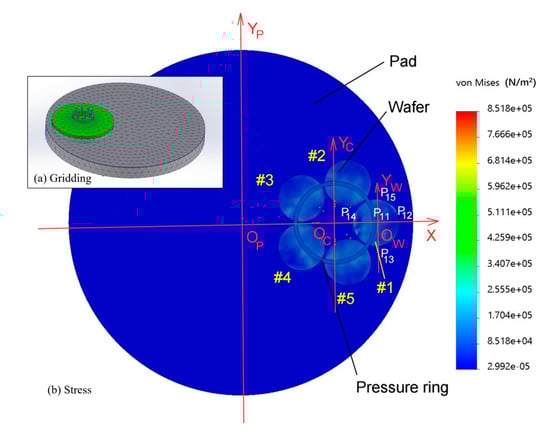 Figure 4 shows the polishing pad, wafer, and pressure ring. An OPXYP coordinate system is established with the center OP of the polishing pad as the origin. The carrier is also associated with the pressure ring concentric Oc, which establishes the OCXYC coordinate system for the origin. The OwXY coordinate system is established with the center Ow of the wafer as the origin.