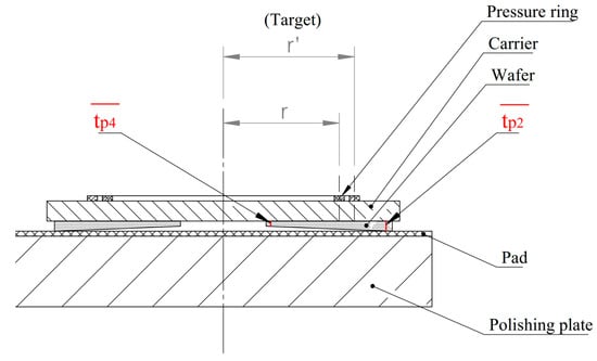 As shown in Figure 5, and are the average values of the center point of P4 near the center point of the pressure ring and P2 far from the center point of the pressure ring on the silicon wafer, respectively. Assuming that the silicon wafer is polished into a tilt, the value of in the figure is smaller than that of ; that is, the place near the center of the pressure ring is subjected to greater stress, resulting in greater removal of the polishing. The radius of the pressure ring in the current state is r, and the radius of the target pressure ring that needs to be adjusted is set to r’. The following mathematical model is constructed: