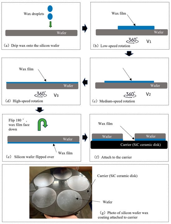 As shown in Figure 6, the silicon wafer bonding process first involves dropping 1–2 mL of melted wax droplets onto the silicon wafer on the wax coating and attaching automation equipment (a). Then, by rotating the silicon wafer at low, medium, and high speeds (b–c–d three stages), the wax liquid is evenly dispersed under centrifugal force to form a wax film of approximately 1–2 μm. The silicon wafer is flipped 180° again, with the wax film facing downwards (e), and finally it is attached to the carrier (f). A photo of the silicon wafer after bonding is shown in (g).
