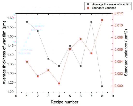 As shown in Figure 7, through the experimental comparison of eight process recipes for wax-coated silicon wafers, in recipe 4, that is, when the three-stage speed of the wax-coated coating is 1500 rpm, 2500 rpm, and 3000 rpm for 1, 2, and 3 s, respectively, the amount of wax drops per wafer is 1.5 mL, the optimal thickness and standard deviation of the wax layer are 1.3 μm, and the standard variance is only 0.0004 μm2. In this way, the silicon wafer is uniformly fitted with a ceramic disk, and boundary conditions approaching the fixed support are achieved; that is, under the processing force state, the silicon wafer is successfully fitted to the SiC ceramic disk. The deflection deformation also tends to be 0.34 μm under the fixed support boundary condition, which is conducive to achieving a removal uniformity deviation of 3 μm.