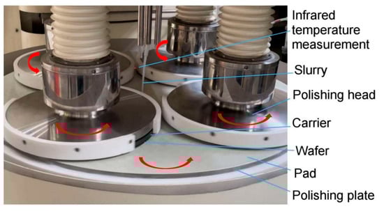 As shown in Figure 8, in the processing area of chemical mechanical polishing of four polishing head silicon wafers, one side of the polishing plate is attached to a polyurethane polishing pad, and the silicon wafer is attached to the carrier as a processing workpiece with a wax coating, that is, on a high-precision SiC ceramic substrate. The ceramic carrier is pressed under the polishing head, and the four polishing heads are in a symmetrical uniform state. The number of silicon wafers attached to a ceramic carrier under each polishing head varies according to the size and quantity of silicon wafers. The 5-inch silicon wafers tested in this paper are attached with 5 wafers of the same thickness to each ceramic carrier, and a total of 20 wafers are processed under full load in a batch. The CMP polishing liquid was a SiO2 abrasive suspension with KOH alkaline solution added. Both the polishing plate and the polishing head are rotated in the same direction at approximately 60 rpm. The polishing slurry flows down the middle, flows into the processing area under the guidance of the rotation of the polishing plate and the polishing head and the groove of the polishing pad, and then returns to the polishing liquid barrel. As shown by the red arrow in Figure 8, the polishing plate and polishing head rotate in the same direction. An infrared thermometer is installed on the polishing pad to monitor the temperature on the polishing pad in real time [,,]. An infrared thermometer was used to detect the polishing slurry on the pad during processing. In the experiment, constant temperature control of the polishing slurry was used, which can maintain a constant temperature of the polishing slurry in multiple experiments. This avoids the influence of the temperature increase caused by processing heat on the uniformity of removal in multiple consecutive experiments.