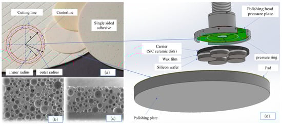 Figure 9 shows a schematic diagram of the production of the pressure ring, which is made of MH™ series polishing pads, NITTA DuPont INCORPORATED []. As shown in (b) and (c), it is an elastic material with loose pores. The material of the polishing pad is mainly polyurethane, with a thickness of 1.3 mm, a Shore hardness of A84, and a density of 0.52 g/cm3. It is cut according to the required inner and outer diameters and then bonded to the polishing head pressure plate via the single-sided bonding function of the polishing pad.