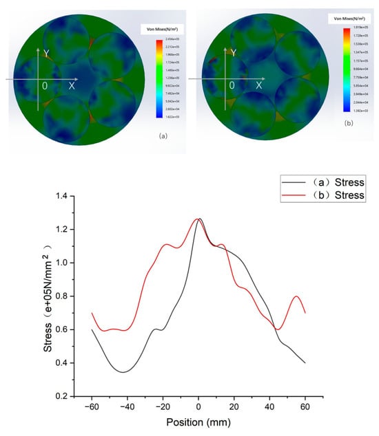Figure 10 compares the stress distributions under two different pressure rings under the condition of 1000 N applied to each polishing head. (a) is a pressure ring with an inner radius of 100, and the influence of the pressure ring is closer to the center of the carrier and the inside of the silicon wafer. (b) is a pressure ring with an inner radius of 110, and the effect of the pressure ring is more centered homogenization on the silicon wafer; that is, the stress uniformity (b) is better than that in (a).