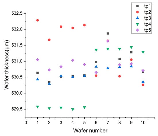Numbers one to five in Figure 11 are the thickness values before pressure ring adjustment. The tp4 data shown in green are smaller than the tp2 data shown in red, whereas the tp1, tp3, and tp5 data are close, indicating that the removal rate of the silicon wafer at point 4 close to the center of the carrier is higher than that at point 2 due to greater stress. By increasing the diameter of the pressure ring, the thickness values obtained from the silicon wafers numbered 6 to 10 become more concentrated. This figure shows that the stress distribution can be improved by adjusting the pressure ring, thus improving the removal uniformity.