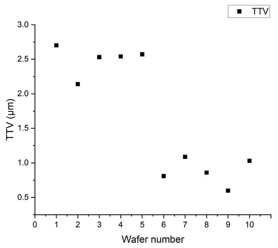 Figure 12 shows the TTV comparison diagram of the silicon wafers. Numbers one to five on the left side of the figure are the TTVs of the silicon wafers before pressure ring adjustment, which are between 2.0 and 3.0 μm. Numbers 6 to 10 on the right are the adjusted values of the pressure rings, which range from 0.5 to 1.25 μm. This figure shows that the TTV can be significantly improved by increasing the stress distribution uniformity by adjusting the pressure ring.