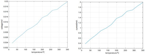 Then, we tested the thermoelectric response characteristics and high temperature stability. By establishing a high-precision temperature control system, the voltage and current of the thin-film thermocouple were accurately tested at different temperature differences, and its Zeebek coefficient was analyzed. The thin-film thermocouple was tested at a high temperature for a long time (the temperature is as high as 600 °C), and its performance changes were recorded in real time to evaluate its long-term stability. Figure 4 shows the test results of voltage and current.